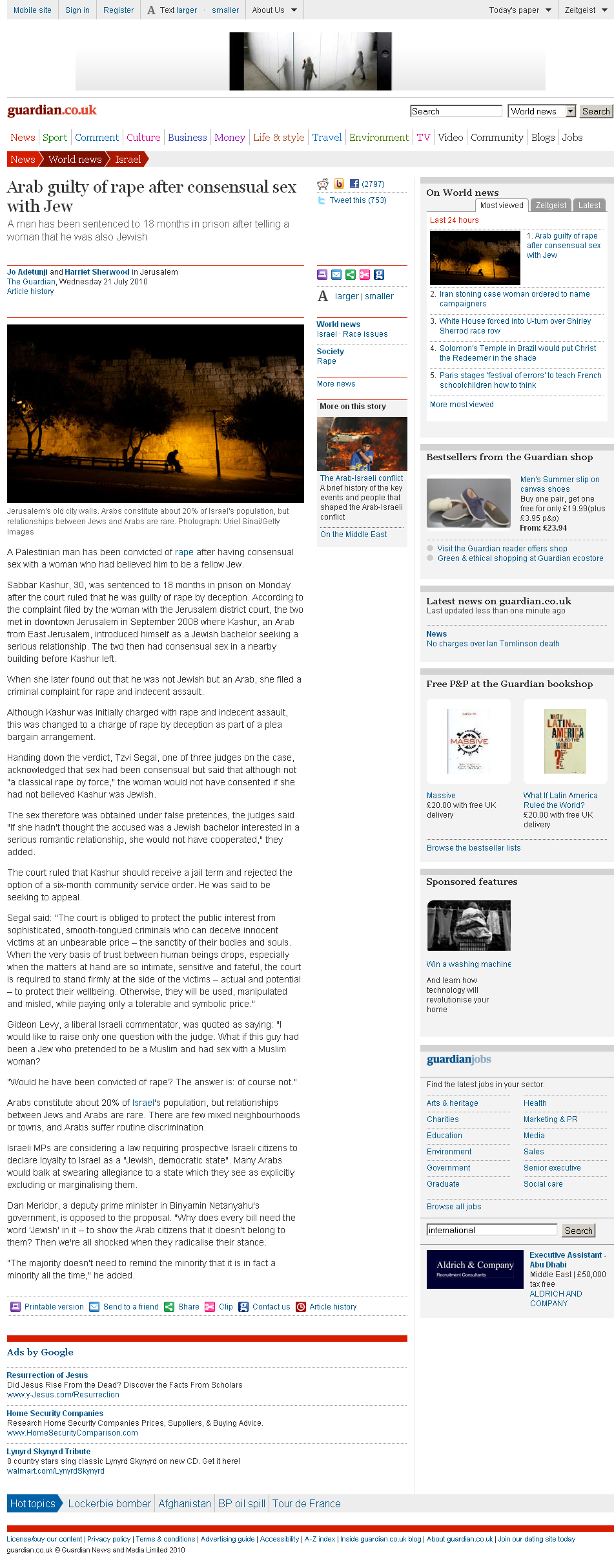 Gideon Levy, a liberal Israeli commentator, was quoted as saying: "I would like to raise only one question with the judge. What if this guy had been a Jew who pretended to be a Muslim and had sex with a Muslim woman?