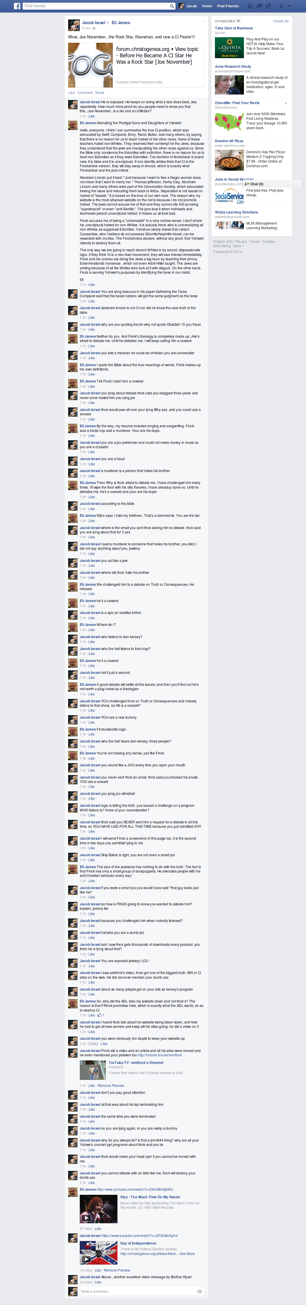 This Jacob Israel fellow really seems to be hounding Eli James on Facebook, and when Eli gets caught up in an argument his lies readily become evident.